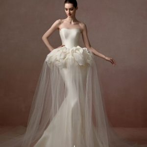 Nếu bộ suit đại diện cho quyền lực thì Graceful Blossom chính là hiện thân cho sự duyên dáng thuần khiết của người phụ nữ. Một thiết kế khiến thời gian như ngừng lại bởi sự kết hợp hoàn hảo giữa kỹ thuật dựng phom corset sắc sảo và nghệ thuật xếp nếp voan tơ mềm mại.