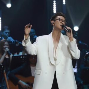 Thiết kế: Phom dáng Oversized phóng khoáng, kết hợp cùng sơ mi lụa cổ đổ (drape) sâu đầy gợi cảm, phá bỏ sự gò bó của âu phục truyền thống.